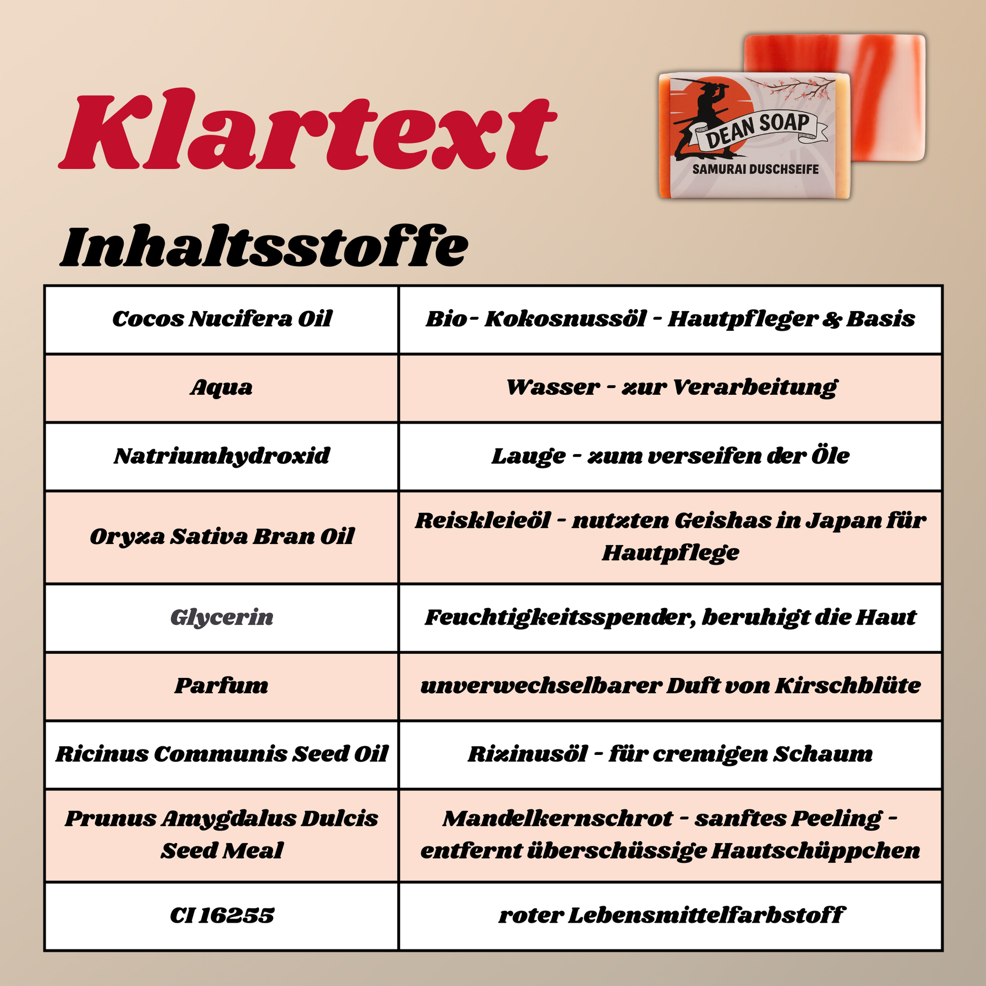 In unserer Duschseife vereinen wir die Härte der Samurai mit der Sanftheit der Kirschblüte und addieren die herausragende Pflege hinzu. Der einzigartig intensive Duft und das angenehme Peeling der geschroteten Mandelkerne ist ideal für dein fernöstliches Wellness-Feeling.