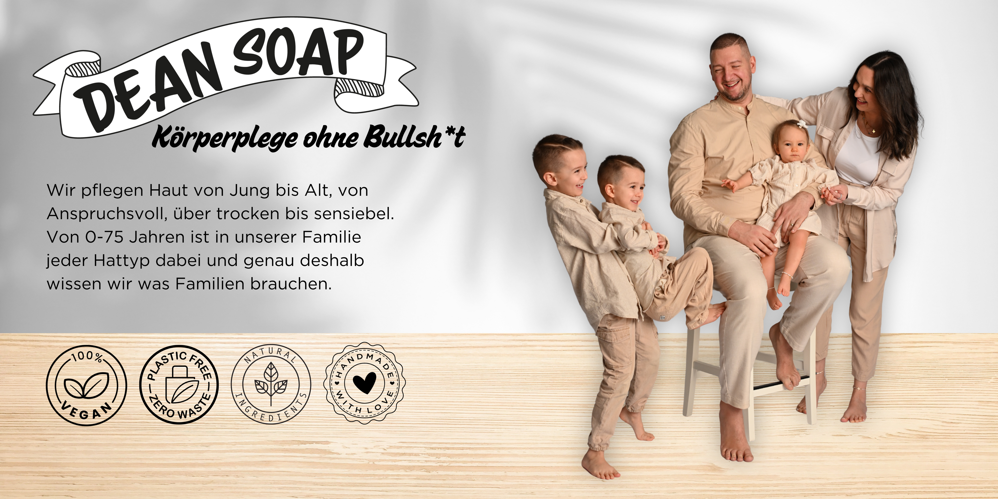 Willkommen bei DeanSoap – deinem Familienbetrieb für handgemachte, vegane und dermatologisch getestete Körperpflegeprodukte. Bei uns dreht sich alles um echte Qualität, natürliche Inhaltsstoffe und liebevolle Handarbeit.