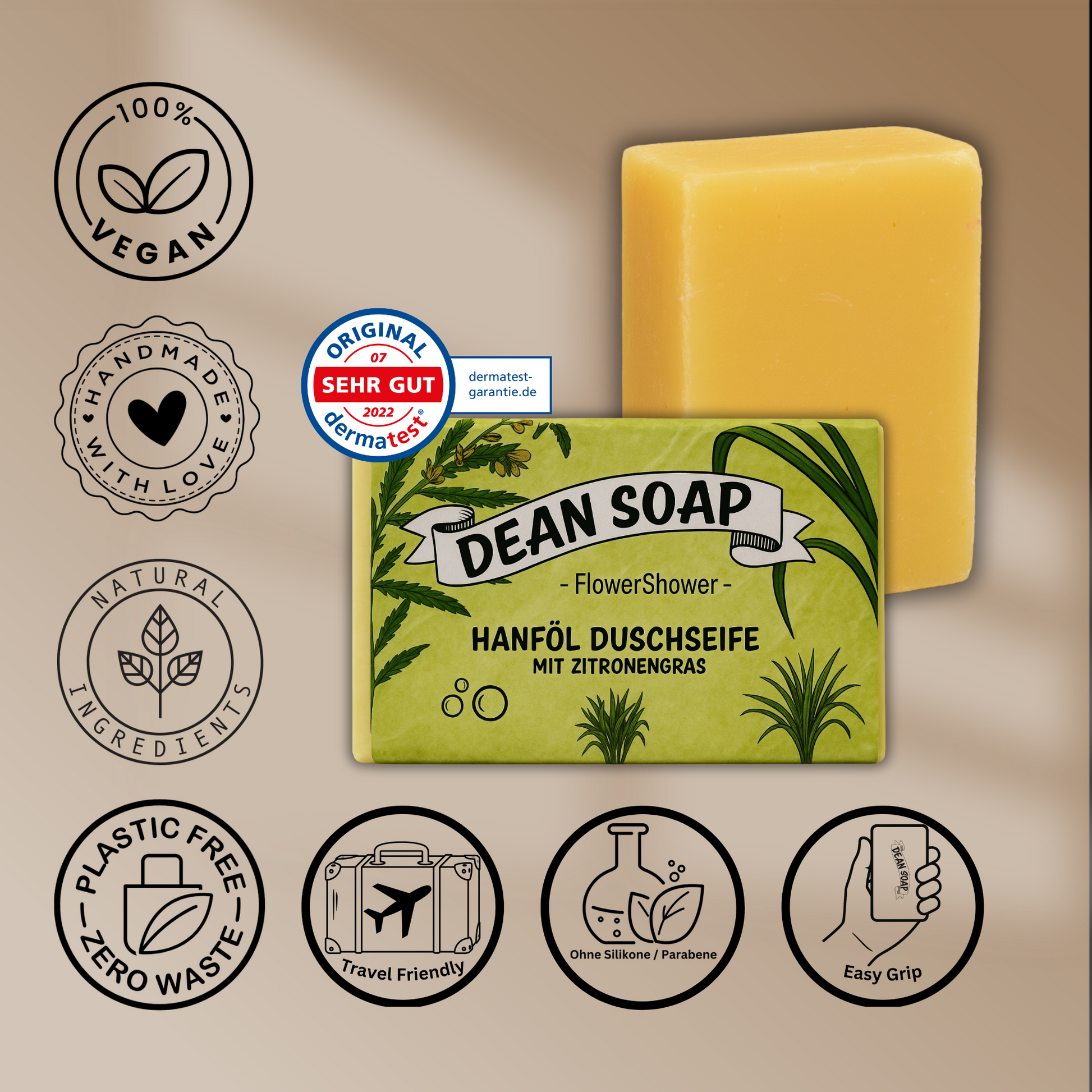 Die Pure Frische plus die Vorteile von Hanföl und Zitronengras perfekt verrührt in einem wohlgeformten Stück Deansoap .